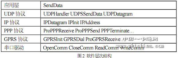 程序中的所有代碼都是由C 語言編寫的,并采用分層的結(jié)構(gòu),從底到上分別為:串口驅(qū)動層、GPRS 模塊驅(qū)動層、PPP 協(xié)議層、IP 協(xié)議層、UDP 協(xié)議層與應(yīng)用層。上層函數(shù)的實現(xiàn)需要應(yīng)用到底層函數(shù),而底層函數(shù)的任務(wù)就是為上層函數(shù)提供服務(wù),最終完成應(yīng)用層任務(wù)——傳送數(shù)據(jù)。各層的主要函數(shù)如圖2 所示: