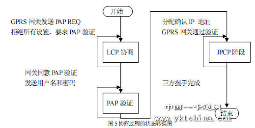 系統(tǒng)的一個難點是微控制器登陸 GPRS 網(wǎng)關(guān)(GGSN)并與網(wǎng)關(guān)通過LCP、PAP、IPCP 協(xié)議進行協(xié)商的過程。LCP、PAP 與IPCP 協(xié)議的幀結(jié)構(gòu)大同小異,最常用的為請求(REQ)、同意(ACK)和拒絕(NAK)三種幀。微控制器與GGSN 各為一方進行協(xié)商,任何一方都可以發(fā)送REQ 幀請求某方面的配制,另一方覺得配置不能接受會回應(yīng)NAK 幀,如果可以則回應(yīng)ACK 幀。為了節(jié)省資源,我們只處理這三種數(shù)據(jù)幀,其它鏈路問題都由微控制器在程序控制下自己重新?lián)芴柦鉀Q。協(xié)商過程大致描述如下:在撥號成功連接后,GGSN 首先會返回一個PAP REQ 數(shù)據(jù)幀。我們發(fā)送一個空 LCP REQ 幀,以強迫進行協(xié)議協(xié)商階段。隨后,GGSN 發(fā)送LCP 設(shè)置幀,我們拒絕所有的設(shè)置并請求驗證模式。GGSN 選擇CHAP 或PAP 方式驗證,我們只接受PAP 方式。然后,進行PAP 驗證用戶名和密碼過程,在GPRS 中用戶名與密碼都為空,如果成功,GGSN 會返回IPCP報文分配動態(tài)IP 地址。此時,就完成了與GGSN 的協(xié)商過程。協(xié)商過程的狀態(tài)轉(zhuǎn)換如圖5 所示。