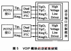 VOIP模塊的功能連接圖如圖5所示。Dual SMD PTC叫做雙重?zé)崦綦娮,可對過熱和過流雙重作用導(dǎo)致的電路故障進行保護;Tip and Ring(正極線和負(fù)極線)表示組成電話配線電路的兩條電線,Tip是正極線的別稱,Ring是負(fù)極電線的別稱。