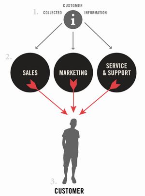 傳統(tǒng)CRM是將公司搜集到的消費(fèi)者有關(guān)信息輸入到CRM系統(tǒng)中,通過銷售、市場推廣以及產(chǎn)品服務(wù)等措施,借此有可能獲得更多的潛在目標(biāo)消費(fèi)者。