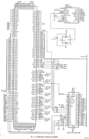 BT8474是一個(gè)PCI多功能設(shè)備。本系統(tǒng)中,其功能0實(shí)現(xiàn)鏈路層的控制;功能1完成物理層的控制。BT8474是由1個(gè)主接口、4個(gè)串口、1個(gè)EBUS端口和1個(gè)邊界掃描口構(gòu)成。主接口通過(guò)PCI的兩個(gè)功能配置區(qū)找到基地址寄存器,系統(tǒng)根據(jù)訪問(wèn)的地址值決定選擇的功能;串行接口完成主接口和物理接口器件的數(shù)據(jù)傳輸;EBUS端口通過(guò)內(nèi)置的MPU(微處理器單元)來(lái)擴(kuò)展外圍設(shè)備,物理接口器件BT8370是一個(gè)T1/E1收發(fā)成幀器,可支持LineRate為1.544 Mb/s(T1)或者2.048 Mb/s(E1)的收發(fā)接口。物理線性接口電路恢復(fù)來(lái)自于電纜的“+3 dB~-43 dB”的模擬時(shí)鐘和數(shù)據(jù)。圖1給出了E1數(shù)據(jù)采集卡硬件設(shè)計(jì)原理圖。