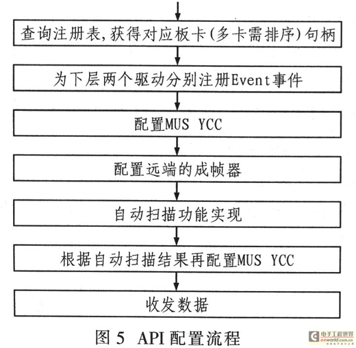 由于E1數(shù)據(jù)采集卡的MUSYCC控制器是PCI多功能設(shè)備,所以應(yīng)用程序應(yīng)當(dāng)合理調(diào)整兩個(gè)功能驅(qū)動(dòng)程序的控制順序,實(shí)現(xiàn)E1數(shù)據(jù)的正常采集。其E1卡應(yīng)用程序(API)的配置流程如圖5所示。