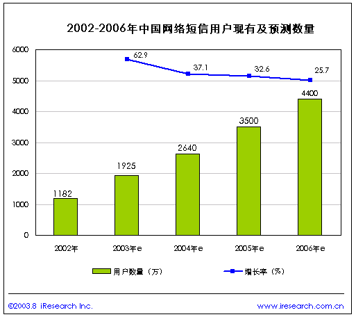 上海艾瑞市場(chǎng)咨詢有限公司是一家專注于網(wǎng)絡(luò)媒體、網(wǎng)絡(luò)營(yíng)銷等網(wǎng)絡(luò)經(jīng)濟(jì)領(lǐng)域的專業(yè)市場(chǎng)調(diào)研機(jī)構(gòu)。公司近期發(fā)布《2003年中國(guó)網(wǎng)絡(luò)短信研究報(bào)告》,該報(bào)告中根據(jù)中國(guó)的網(wǎng)絡(luò)經(jīng)濟(jì)發(fā)展情況預(yù)測(cè):2003年中國(guó)網(wǎng)絡(luò)短信用戶將達(dá)到1925萬(wàn),2004年將達(dá)到2640萬(wàn)。