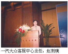 一汽大眾客服中心主任趙荊璞由于其在客戶服務(wù)方面的杰出貢獻(xiàn)被評(píng)為"2005中國(guó)最佳呼叫中心管理人",并作為獲獎(jiǎng)代表在大會(huì)上發(fā)了言。?