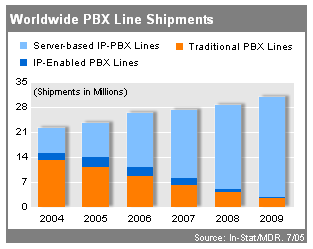 據(jù)In-Stat報(bào)告說,隨著IP線路出貨量今年有望超過傳統(tǒng)PBX,IP PBX進(jìn)入了一個(gè)新的成熟階段。雖然整個(gè)PBX市場(chǎng)預(yù)計(jì)將以6.6%的復(fù)合年增長(zhǎng)率增長(zhǎng)至2009年,但傳統(tǒng)PBX正在迅速下滑,IP PBX勢(shì)頭越來(lái)越強(qiáng)。