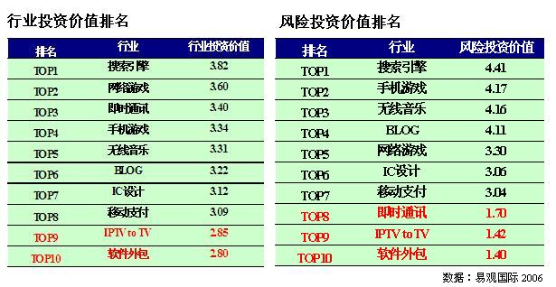 易觀國際投資分析師李璟對記者介紹:“本次評估中十大熱點(diǎn)領(lǐng)域的前8名都具有投資價值。但位居最后的 IPTV 和軟件外包行業(yè),雖然投資價值得分低于3分,并不代表其三年后沒有投資價值,易觀國際的行業(yè)投資價值評估模型是以3年作為一個評估周期的。我們認(rèn)為