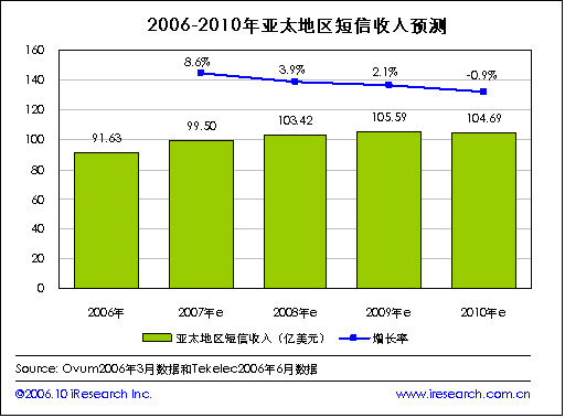 iResearch艾瑞市場(chǎng)咨詢根據(jù)咨詢公司Ovum和網(wǎng)絡(luò)應(yīng)用公司Tekelec在2006年的數(shù)據(jù)整理發(fā)現(xiàn),到2010年亞太地區(qū)的短信收入有望達(dá)到104.69億美元,2006年亞太地區(qū)的短信收入在91.63億美元。