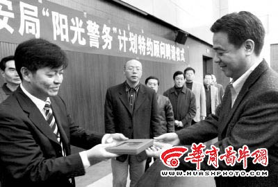 昨日下午2時許,重慶市公安局“陽光警務(wù)”特約顧問聘請儀式上,重慶市公安局副局長、政治部主任彭長健頒發(fā)了特約顧問聘書。重慶市社會科學(xué)院研究員孫元明等18人成為我市警方首批聘請的“陽光警務(wù)”特約顧問。他們將作為警方的“智囊團(tuán)”直接參與、監(jiān)督警務(wù)活動,聘任時間為兩年。