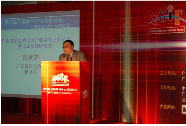 由廣東省信息協會、廣東省電子商務協會聯合主辦,廣東省信息協會客戶服務專業(yè)委員會、廣州市品派文化傳播有限公司策劃承辦,AVAYA公司總協辦的第四屆中國呼叫中心國際論壇于2007年1月23日在廣州亞洲國際大酒店隆重舉行,廣東省信息產業(yè)廳副廳長俞建飛出席會議并致開幕詞。會上,廣東省信息協會秘書長黃觀輝、AVAYA公司銷售總經理楊晨、民生銀行電子銀行部華南運營中心總經理李濤、網易客戶服務部總監(jiān)張云等分別做了主題發(fā)言。來自全國各地300多位企業(yè)管理人員參加了本次論壇。