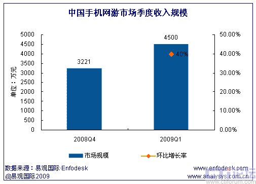 2009年第1季度中國手機(jī)網(wǎng)游市場規(guī)模為4500萬元