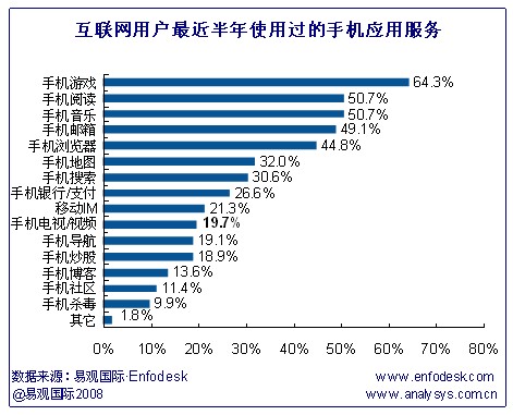 互聯(lián)網(wǎng)用戶近半年使用過(guò)的手機(jī)應(yīng)用按比例排列依次是手機(jī)游戲、手機(jī)閱讀、手機(jī)音樂(lè)、手機(jī)郵箱以及手機(jī)瀏覽器。其中手機(jī)游戲的使用率達(dá)64.3%。手機(jī)閱讀、手機(jī)音樂(lè)及手機(jī)郵箱的使用率均在一半左右,而手機(jī)瀏覽器的使用率達(dá)44.8%。具體如下圖: