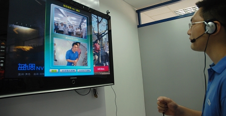 工作人員演示電視視頻通話。