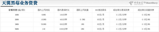 目前電信推出的黑莓手機套餐分為四類,一類為天翼黑莓簡裝版,價格為每月189元,包括60MB國內(nèi)上網(wǎng)流量,100分鐘國內(nèi)語音通話時長;第二類是天翼黑莓標(biāo)準(zhǔn)版套餐,價格為289元,包括100MB國內(nèi)上網(wǎng)流量,0.5MB國際上網(wǎng)流量,400分鐘國內(nèi)語音通話時長;第三類和第四類為天翼尊享版套餐包括389元和589元兩種資費,前者包括500MB國內(nèi)上網(wǎng)流量,1MB國際上網(wǎng)流量,600分鐘國內(nèi)語音通話時長;后者包括1GB國內(nèi)上網(wǎng)流量,2MB國際上網(wǎng)流量,1000分鐘國內(nèi)語音通話時長。