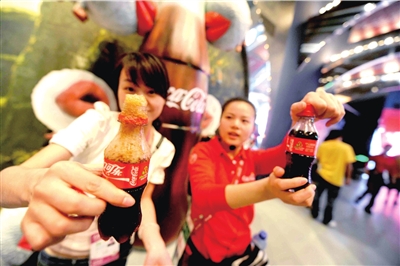 昨天世博園里溫度很高,記者逛得口干舌燥,抬頭看到一個高達15米的巨型LED可口可樂瓶,這是“快樂工坊”的招牌。