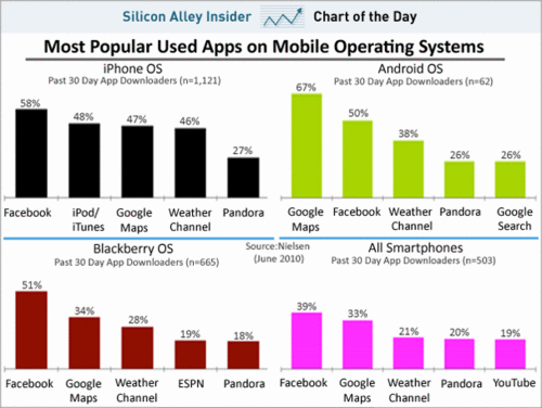 6月11日消息,據(jù)Businessinsider網站報道,尼爾森分析了各個智能手機平臺上最流行應用軟件的使用情況(如圖)。從圖中可以看出,各個平臺應用軟件的使用情況相當一致。