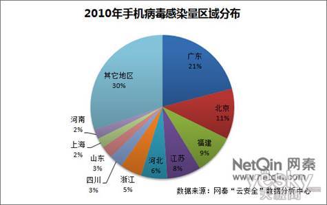 感染地域方面,《2010年中國大陸地區(qū)手機(jī)安全報(bào)告》指出,2011年我國廣東地區(qū)以21%的感染比例,成為手機(jī)病毒的感染重災(zāi)區(qū),北京,上海,福建、江蘇等地位居其后。沿海發(fā)達(dá)地區(qū),已成為手機(jī)病毒的感染重災(zāi)區(qū)。