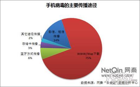 感染途徑方面,《2010年中國大陸地區(qū)手機(jī)安全報(bào)告》指出,據(jù)網(wǎng)秦“云安全”數(shù)據(jù)分析中心統(tǒng)計(jì),當(dāng)前通過手機(jī)訪問wap和www網(wǎng)站感染病毒的比率達(dá)75%;通過短信、彩信感染病毒的比率占14%;通過藍(lán)牙傳輸方式感染病毒的比率占6%;通過存儲卡等途徑感染病毒的比率占3%;另外2%的用戶則是被其它傳播途徑的病毒感染。其中聯(lián)網(wǎng)感染病毒的機(jī)率最大,成為用戶面臨的最主要威脅。