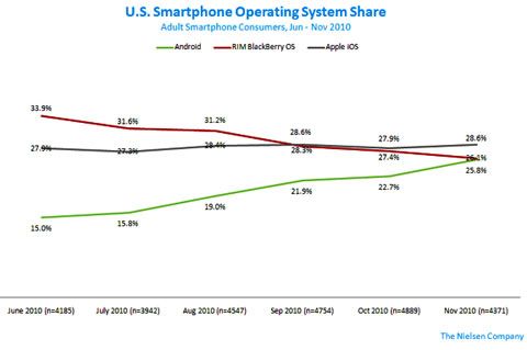 尼爾森的報告認(rèn)為,自智能手機在數(shù)年前成為一個數(shù)十億美元的市場后,為爭奪手機“消費市場份額的競爭已經(jīng)變得空前激烈”。尼爾森在稍早的報告中表示,由于蘋果、谷歌和RIM的智能手機用戶進一步增加,智能手機市場增勢在短期內(nèi)不會趨緩。