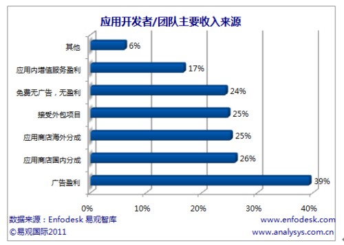 易觀國際(Analysys International)分析認(rèn)為應(yīng)用開發(fā)者難以獲取盈利分成的主要原因在于用戶對(duì)應(yīng)用本身沒有付費(fèi)下載習(xí)慣,應(yīng)用商店缺少對(duì)應(yīng)用的推廣,但應(yīng)用開發(fā)者難以盈利也和移動(dòng)應(yīng)用同質(zhì)化嚴(yán)重,難以被用戶認(rèn)可本身強(qiáng)相關(guān)。