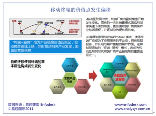 易觀智庫Enfodesk在近期發(fā)布《中國移動(dòng)互聯(lián)網(wǎng)市場(chǎng)年度綜合報(bào)告2011》中認(rèn)為,隨著3G的普及以及多元化移動(dòng)應(yīng)用的出現(xiàn),智能手機(jī)取代功能手機(jī)已成定勢(shì),導(dǎo)致傳統(tǒng)的移動(dòng)終端價(jià)值點(diǎn)開始由產(chǎn)品化向服務(wù)化遷移。終端廠商原有模式也受到極大挑戰(zhàn)。若不進(jìn)行有效轉(zhuǎn)型恐難以在未來2-3年后的手機(jī)市場(chǎng)生存。