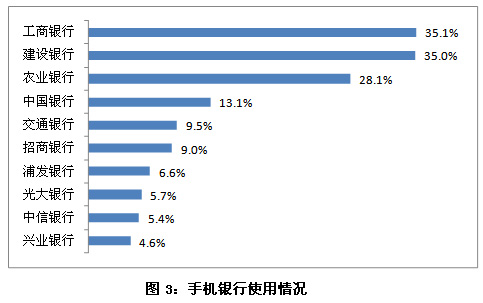 在對手機銀行用戶對手機銀行使用的情況分析來看,工商銀行(601398,股吧)手機銀行的使用率依然最高,達35.1%,建設(shè)銀行(601939,股吧)緊隨其后,為35.0%。通過進一步的分析發(fā)現(xiàn),在經(jīng)常使用手機銀行的用戶中,對建設(shè)銀行手機銀行的使用率(37.4%)略高于對工商銀行的使用率(36.0%),這表明建設(shè)銀行的用戶相對養(yǎng)成了使用手機銀行的習慣。另外,農(nóng)業(yè)銀行(601288,股吧與中國銀行的使用率在這半年中都有顯著提升,不斷縮小與行業(yè)領(lǐng)跑者的差距。