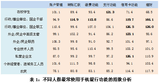在本次調(diào)研中,對不同人群最常使用手機銀行功能的指數(shù)分析表明,在校學生更傾向于經(jīng)常使用手機銀行支付功能,較少使用手機理財功能;行政/事業(yè)單位、國企干部更傾向于使用手機銀行的轉(zhuǎn)賬匯款功能、繳費功能、信用卡功能和理財功能,尤其是理財功能;行政/事業(yè)單位、國企職工經(jīng)常使用信用卡功能和理財功能的傾向性也非常明顯;外企/民企中高級主管則更傾向于經(jīng)常使用信用卡功能;私營企業(yè)主經(jīng)常使用手機銀行信用卡功能的傾向性顯著。