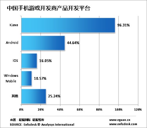 根據(jù)易觀國際的數(shù)據(jù)顯示,截至2010年底,中國手機游戲用戶規(guī)模突破1.3億,同比增長52.11%,同期中國手機游戲市場規(guī)模達33億,伴隨著整體市場的發(fā)展手機游戲開發(fā)商隊伍也逐漸完善;為了更好的研究手機游戲市場,近期易觀國際對手機游戲開發(fā)商進行調(diào)研,推出《中國手機游戲開發(fā)商研究報告2010》,以期對手機游戲市場提供有價值的信息,通過調(diào)研發(fā)現(xiàn)KJava依舊是中國手機游戲開發(fā)商的主要開發(fā)平臺。