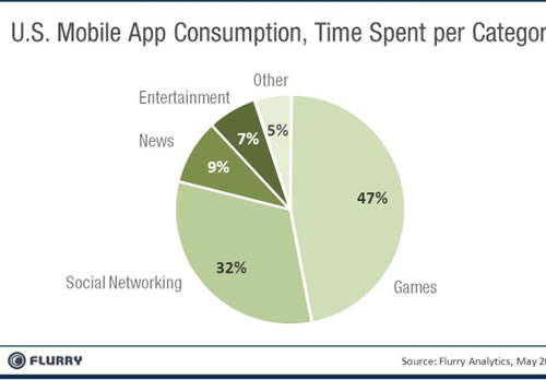 Flurry研究了不同應(yīng)用類別占用時(shí)間。通過對2011年5月份超過8.5萬個(gè)應(yīng)用數(shù)據(jù)的抓取,得到如圖數(shù)據(jù):