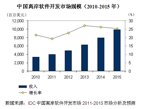 IDC數(shù)據(jù)顯示,2010年中國(guó)離岸軟件開發(fā)市場(chǎng)規(guī)模達(dá)到33.57億美元,同比增長(zhǎng)21.6%,預(yù)計(jì)未來五年將以24.2% 的復(fù)合增長(zhǎng)率快速攀升。
