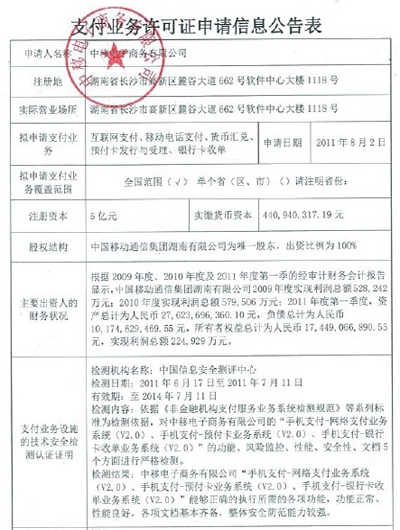 中移動(dòng)申請(qǐng)支付業(yè)務(wù)許可證 湖南移動(dòng)全資運(yùn)營