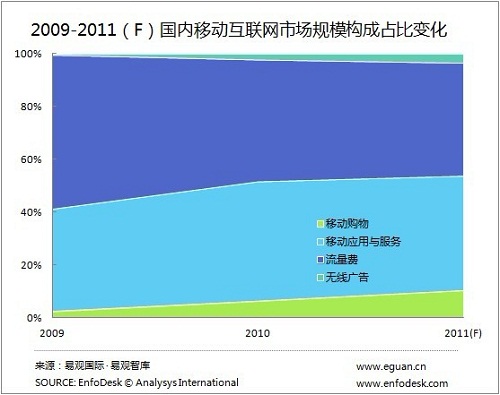 對(duì)比2009年到2011年市場(chǎng)規(guī)模的構(gòu)成變化可以了解到,2011年移動(dòng)購(gòu)物與無(wú)線(xiàn)廣告在規(guī)模占比上都有了很大的提高,尤其是移動(dòng)購(gòu)物,從2009年的規(guī)模占比3%增長(zhǎng)到11%,用戶(hù)對(duì)通過(guò)移動(dòng)終端購(gòu)物的習(xí)慣整逐步被得到培養(yǎng),另外值得注意的是2011年移動(dòng)互聯(lián)網(wǎng)流量費(fèi)占比低于50%,已經(jīng)從2009的58%減少至42%。