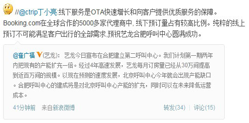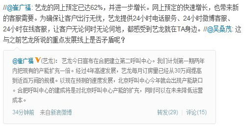 崔廣福在微博上說(shuō):“藝龍的網(wǎng)上預(yù)定已達(dá)62%,并進(jìn)一步增長(zhǎng)。網(wǎng)上預(yù)定的快速增長(zhǎng),也帶來(lái)新的客服需要。為確保讓客戶(hù)出行無(wú)憂(yōu),藝龍?zhí)峁?4小時(shí)電話(huà)服務(wù)、24小時(shí)微博客服、24小時(shí)在線(xiàn)客服,讓客戶(hù)無(wú)論何時(shí)無(wú)論何地,都感受到藝龍就在TA身邊!
