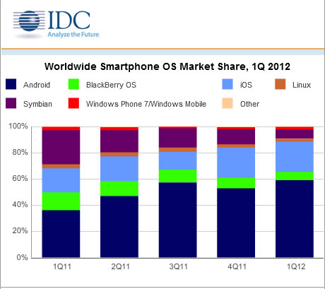Android和蘋果的iOS繼續(xù)主導(dǎo)全球智能手機行業(yè),這兩個平臺的總出貨量占到2012年一季度所有智能手機出貨量的82%。其中Android手機以8900萬臺占據(jù)整個行業(yè)出貨量的59%,而蘋果以3510萬臺的出貨量占據(jù)23%的市場份額。這些數(shù)據(jù)均來自IDC的最新研究報告。