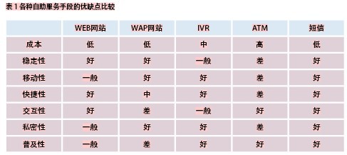 隨著電子化技術和互聯(lián)網(wǎng)技術的發(fā)展和普及,各家運營商都開始推出各種自助化手段分流人工服務壓力,改善用戶滿意度。主要的電子化自助手段有WEB網(wǎng)站、WAP網(wǎng)站、IVR語音交互應答、ATM自動柜員機。每種自助袷侄味加釁涓髯緣撓湃鋇恪?lt;br />