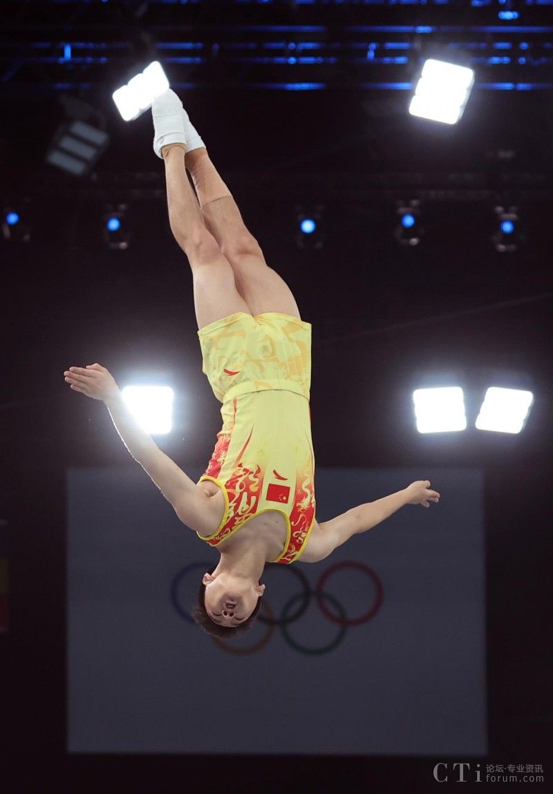 8月2日,中國選手王梓賽在比賽中。當日,巴黎奧運會蹦床項目男子預賽在貝爾西體育館舉行。新華社記者 曹燦 攝
