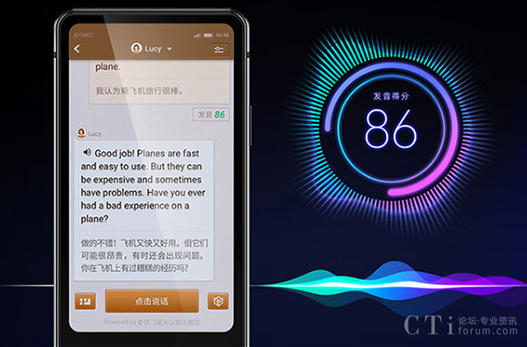 AI教練可以隨時隨地和用戶一對一地聊天,并會將聊天內(nèi)容用中英文對照的方式顯示在屏幕上,同時還會對用戶的口語發(fā)音進(jìn)行智能打分。