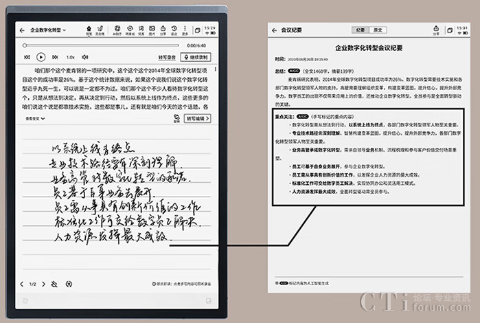 其中會議紀(jì)要功能,可將科大訊飛智能辦公本的語音實(shí)時轉(zhuǎn)寫功能與墨水屏紙感書寫相結(jié)合,并且可以對會議記錄內(nèi)容形成一份精簡的會議紀(jì)要,有助于快速回溯會議內(nèi)容。