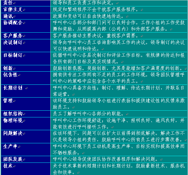 附錄6提供了建議的員工滿意度調(diào)查表?梢宰鳛闇(zhǔn)備制訂呼叫中心使用的版本的起點(diǎn)。在制訂表格時,應(yīng)從所有中心最佳實(shí)踐工作和領(lǐng)導(dǎo)團(tuán)隊確認(rèn)的其他部門取得評估要素。表格6總結(jié)了呼叫中心員工滿意度調(diào)查應(yīng)包含的主要方面: