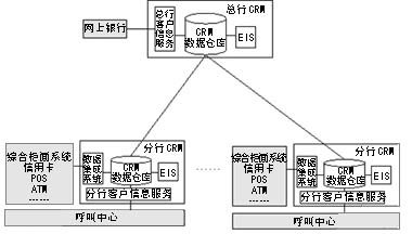 由于銀行在各地建有大量的分支機(jī)構(gòu),銀行CRM系統(tǒng)一般都采用分布式數(shù)據(jù)倉(cāng)庫(kù)環(huán)境,即所有分行均擁有自己的CRM系統(tǒng),并與本地綜合業(yè)務(wù)系統(tǒng)及呼叫中心連接。在總行建有中心CRM數(shù)據(jù)倉(cāng)庫(kù),提供面向全行的分析決策功能,并為網(wǎng)上銀行業(yè)務(wù)提供數(shù)據(jù)查詢(xún)支持。