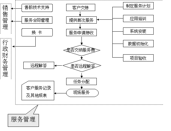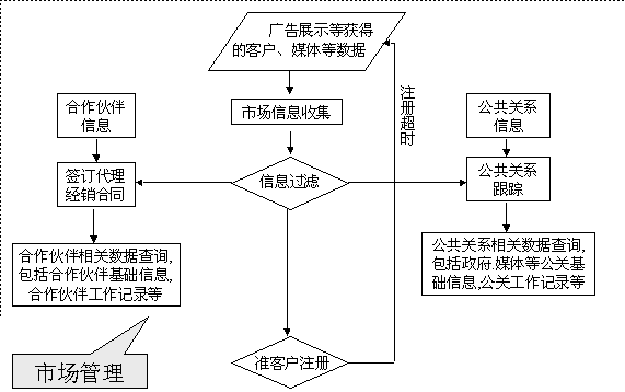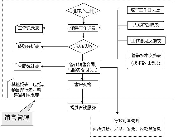 選定適合中小企業(yè)應用的CRM軟件 ----啟利CRM ( ChineseCRM.Net ),并由啟利公司負責提供實施服務。CRM系統(tǒng)的主要模塊包括:市場管理、銷售管理、服務管理、行政管理,各模塊主要業(yè)務流程圖如下: