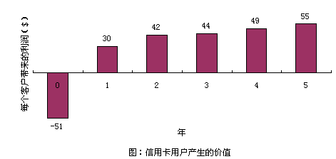 以信用卡服務(wù)為例,爭取一個新的用戶平均要51美圓,用于廣告、推銷和開戶等開支。用戶開始時花錢很少,但為公司帶來一定的利潤。但如果用戶繼續(xù)使用到第二年,就會為公司帶來更多的經(jīng)濟效益,因為公司與客戶之間的信任和客戶對公司的滿意,致使客戶更多地通過信用卡消費。(圖:"信用卡用戶產(chǎn)生的價值")用戶貢獻(xiàn)在增加,公司的運作費用卻在不斷減低。信用卡公司可以不斷減少對客戶信用的審核時間。保持長期的客戶關(guān)系,還可以減少廣告支出,客戶本身就是一個免費的廣告資源。很多人在消費前喜歡聽取朋友的意見,覺得比廣告更可信。