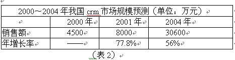 國內CRM市場經(jīng)過一段時間的快速增長,2000年銷售額達到4500萬元左右。2001年市場情況將更好,預計銷售額將是上年的兩倍左右。CCID根據(jù)大量調查分析,對我國CRM市場規(guī)模作出如下預測: