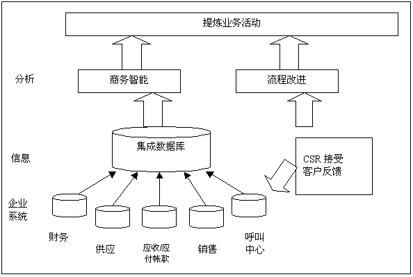 分析型CRM,也著稱為“后臺(tái)”或“戰(zhàn)術(shù)”CRM。用來(lái)分析理解發(fā)生在前臺(tái)的客戶活動(dòng)。分析型CRM需要技術(shù)(編譯和處理大量的客戶數(shù)據(jù),以便于分析)和新的業(yè)務(wù)流程(提煉面向客戶的業(yè)務(wù),以提高忠誠(chéng)度和利潤(rùn)率)。在分析師和業(yè)界專家的推動(dòng)下,如今大多數(shù)CRM供應(yīng)商,或者創(chuàng)造分析型CRM能力,或者與商務(wù)智能(BI)供應(yīng)商合伙,合作分析他們的數(shù)據(jù)。圖2表明了數(shù)據(jù)和流程如何用來(lái)提煉業(yè)務(wù)活動(dòng)。