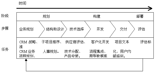 CRM規(guī)劃圖包括三個主要的項目開發(fā)階段:規(guī)劃、構建、部署;它還以“分布驟”為特色,包括許多固定的和可變的任務,簡單介紹如下: