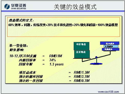 華夏證券經紀業(yè)務總部的姚磊作為唯一的成功應用案例代表,主要是和與會的金融機構分享在客戶關系管理規(guī)劃方面的一些成功經驗。華夏證券認為,對于證券公司的經紀業(yè)務來講,客戶關系管理的主要目標應該是把客戶關系管理系統(tǒng)的核心功能融入開戶、交易、服務、咨詢等四個與客戶互動的過程之中,比如:客戶資料規(guī)戶整合形成統(tǒng)一的客戶號,管理客戶交易偏好和產品偏好上的變化,配合多種渠道建立一對一銷售流程,客戶終身價值管理。在風險控制方面,華夏證券同樣貢獻了寶貴的經驗,在這方面他們認為最重要的方面是要做好高層領導的灌輸和培訓工作,讓企業(yè)的高層領導對于客戶關系管理有一個正確的理解,從而對于項目的投資有一個合理的預期和實證,通俗一點說,就是首先為整個項目找一個合適的發(fā)起人。第二點要注意,要有專業(yè)的項目管理隊伍,這其實就是集成商選擇方面的風險。除此之外,還要對項目要有一個明確的定義,關注每一步提交的結果,在項目過程中就隨時發(fā)現問題、解決問題。