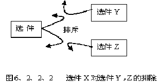 選件的排除關(guān)系是指在產(chǎn)品配置時(shí),選擇了一件就不能選擇另外一件或多件。比如在旅行社在組團(tuán)時(shí)規(guī)定,如選擇了酒店A,就無法選擇組件交通工具中的選件火車,因?yàn)榫频闍離火車站太遠(yuǎn)。圖6、2、2、2說明了這種關(guān)系。
