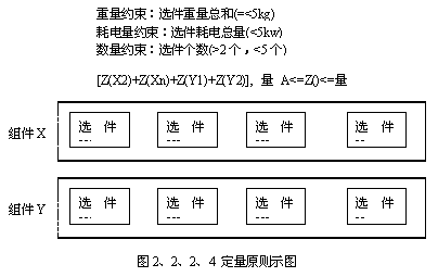 定量原則應(yīng)用于產(chǎn)品配置,是對(duì)所選擇選件的各種量的規(guī)定。比如,組件內(nèi)選件數(shù)量的最少或最高原則,或選件重量總和的最大最小原則等,是定義在組件層面的約束,如圖2、2、2、4所示。