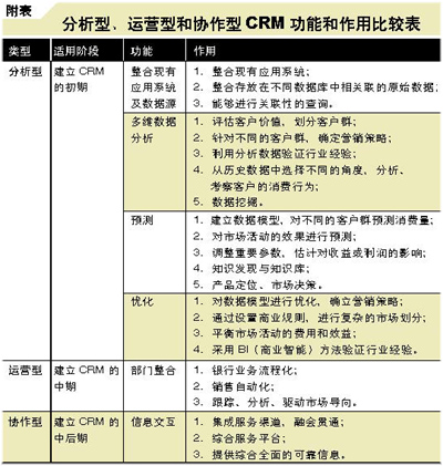 在上述目標(biāo)下,有什么類型的產(chǎn)品可供選擇呢?對(duì)銀行來說,有分析型、運(yùn)營(yíng)型和協(xié)作型3類CRM,而這3類CRM也有著很大差別,對(duì)于有不同需求的銀行需要有不同的選擇。下面詳細(xì)分析這3類CRM。