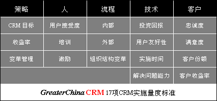 GreaterChinaCRM提出了一組量度標(biāo)準(zhǔn)(五個范圍共17項),不僅覆蓋了軟件/技術(shù)方面的回報,也綜合包括了策略,人,流程,技術(shù)和客戶。這些量度標(biāo)準(zhǔn)告訴我們應(yīng)當(dāng)如何看待和評估CRM的實施。讓我們來看一下: