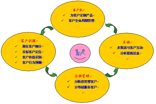 流程涉及到客戶生命周期管理、知識管理的流程。具體來說,流程涉及到兩大方面,其一,CRM成功實施后的企業(yè),應(yīng)該在業(yè)務(wù)流程上一個變革。企業(yè)各個部門開展業(yè)務(wù)的共同前提是:以客戶為中心。其二,企業(yè)應(yīng)當(dāng)通過CRM來建立一種客戶管理的優(yōu)化流程,從客戶識別,到分級管理,再到企業(yè)與客戶互動,再到為客戶定制產(chǎn)品;然后循環(huán)往復(fù)。具體我們可以參見下圖: